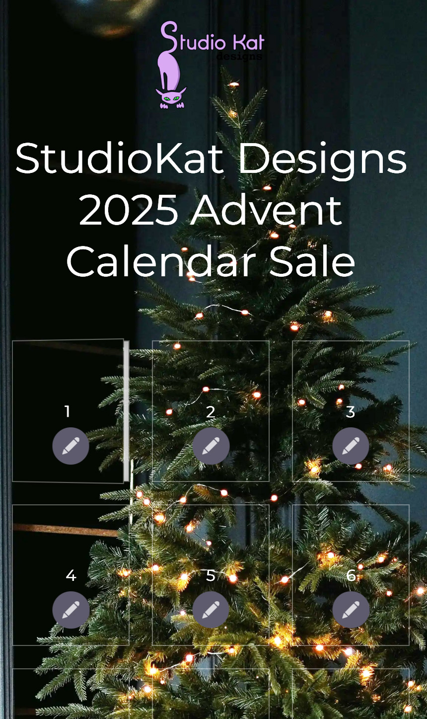 This sale works just like an Advent Calendar works… Starting on Dec 1st and continuing thru Dec 24th, a window on our calendar will automatically open everyday at 12:01am EST revealing one or more items on sale at an amazing 25% discount. Please take note of the discount code, then use the links provided to go to our website to buy one, or more items at the discounted price! But don’t delay! This window will close every night at 11:59pm EST so that the next day’s window can open 2 minutes later!